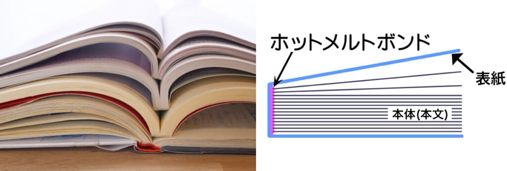 一方無線綴じは、表紙の紙を厚くして樹脂製のボンドで強く固定されているために、本が根元まで広く開きません。