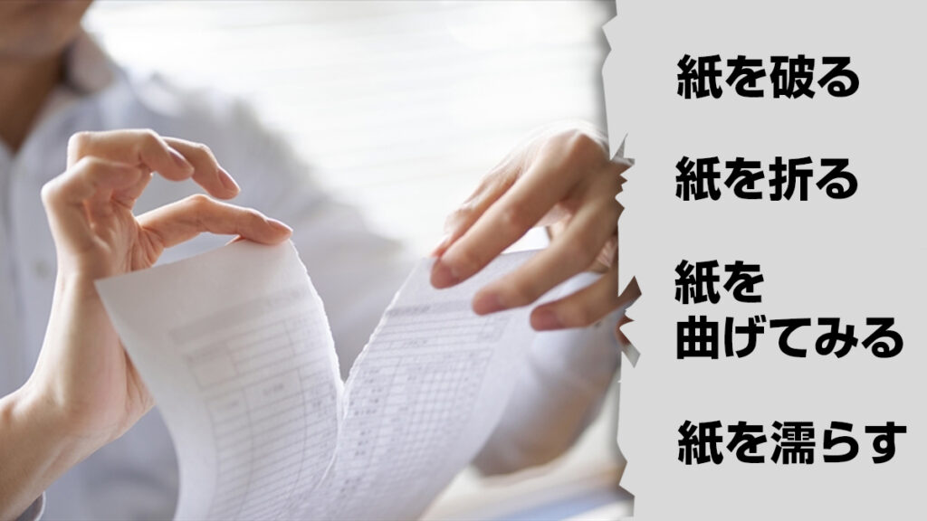 この中で「紙を折る」のは、紙の厚さでやや判別しにくいことはありますが、「紙を破る、紙を曲げてみる」は、紙目を調べるときに普段によく使います。