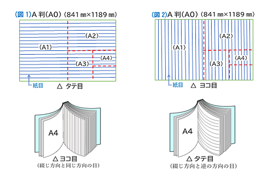 紙目の方向は、A判、B判の原紙からそれぞれA判、B判の全紙をカットする際に決まりますが、A判もB判もヨコ目とタテ目があります。