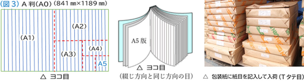 その他のサイズも全て同じです。例えばA5判の本を印刷する場合は、(図3)の様に注文する全紙の紙もヨコ目で、製品もヨコ目になります。