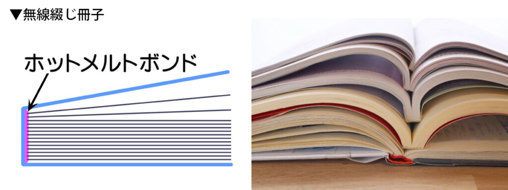 一方無線綴じ冊子は、表紙を巻く際の表紙巻き機の性能により頁数が決まります。