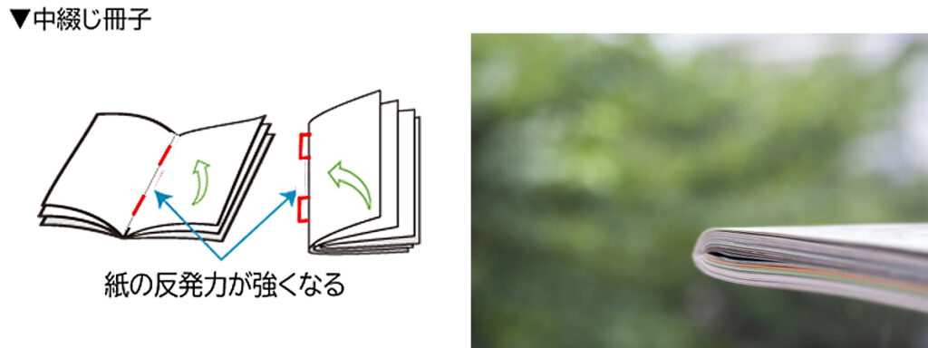 紙の厚さによって対応範囲が異なるのは、紙が厚いと本が厚くなり綴じたときに、本がきれいに閉じられないためです。中綴じは針金で2か所綴じているだけなので、紙が厚いと折ったときに紙の反発力が強くなり製本機の圧力で抑えても、本が閉じにくい傾向があります。