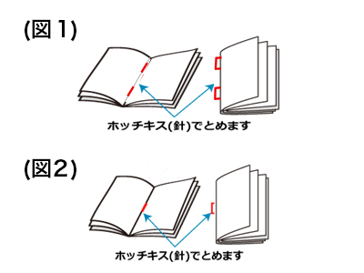 中綴じとは、重ねた紙の中心(折り目部分)を、2本ないし1本の針金(ホチキス)で止める製本形式です。